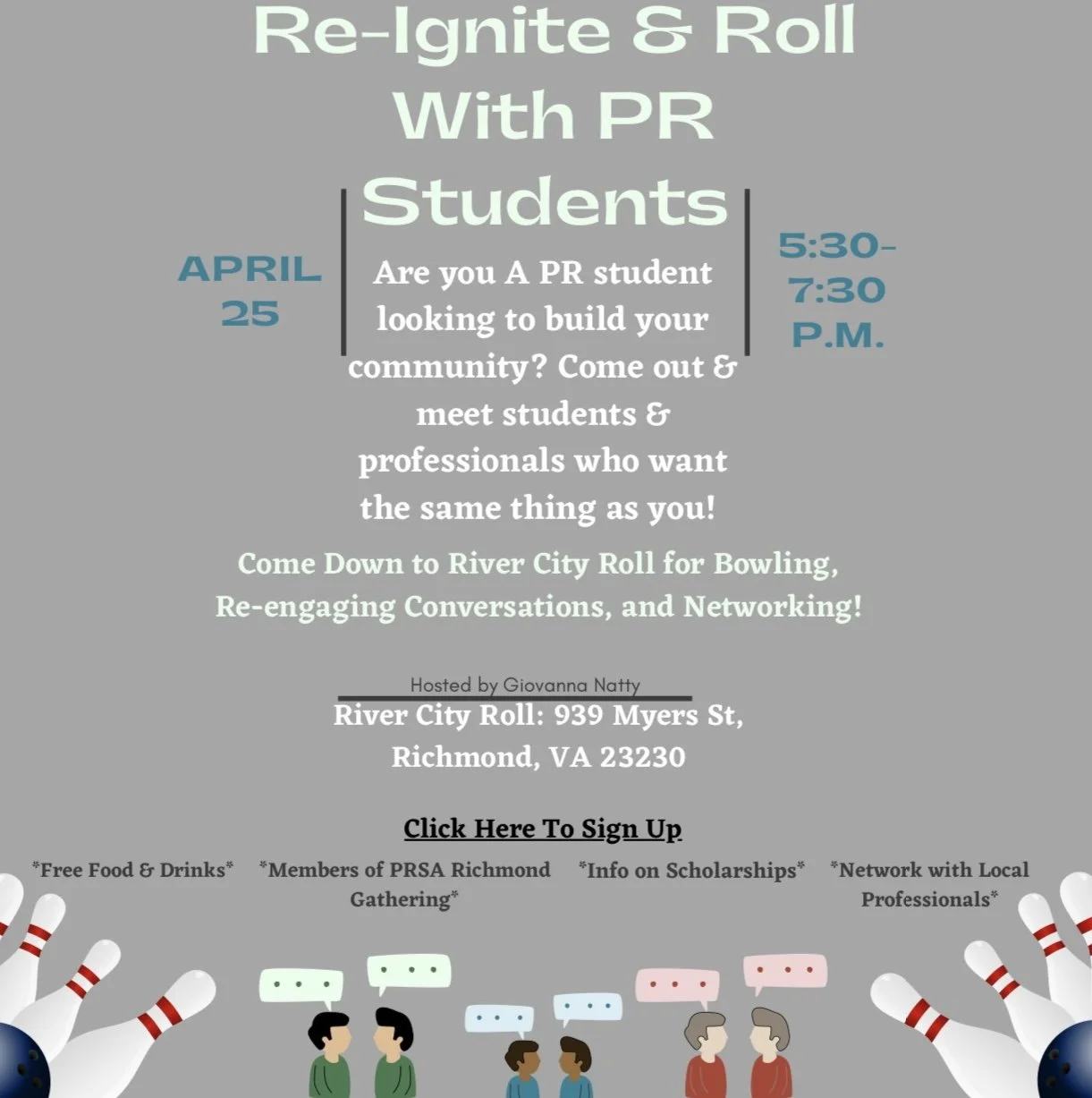 I demonstrated leadership by initiating the creation of Reignite and Roll with PR Students, a networking event designed to connect students with peers and industry leaders from PRSSA in Richmond, VA. The event's success involved sponsored food, scholarship information, internship opportunities, and most importantly, an increase in student relationships.